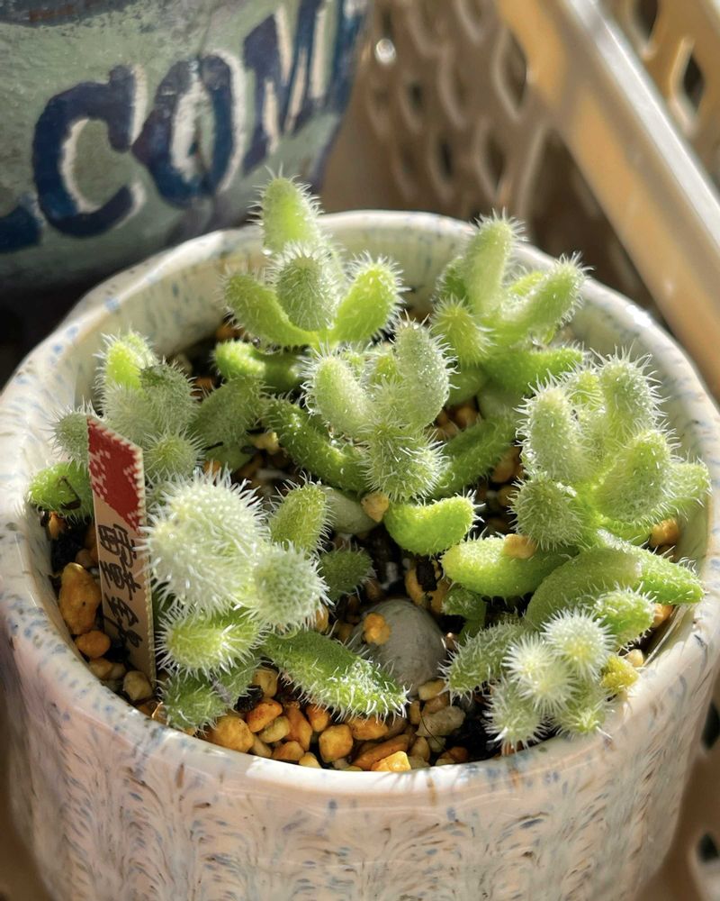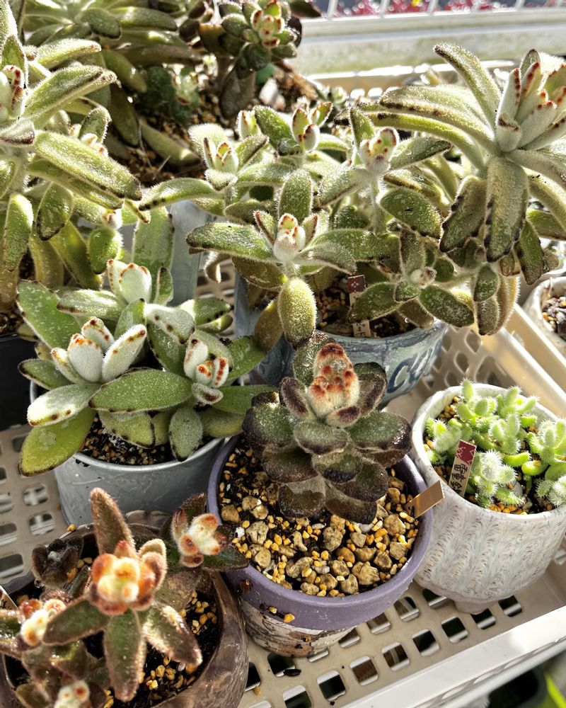 ①雷童錦・・開花後にボロボロになった株を11月にカット挿ししたのが、いつの間にかしっかり根付いてました😊白い毛がキラキラ輝いて見惚れてしまいます✨✨