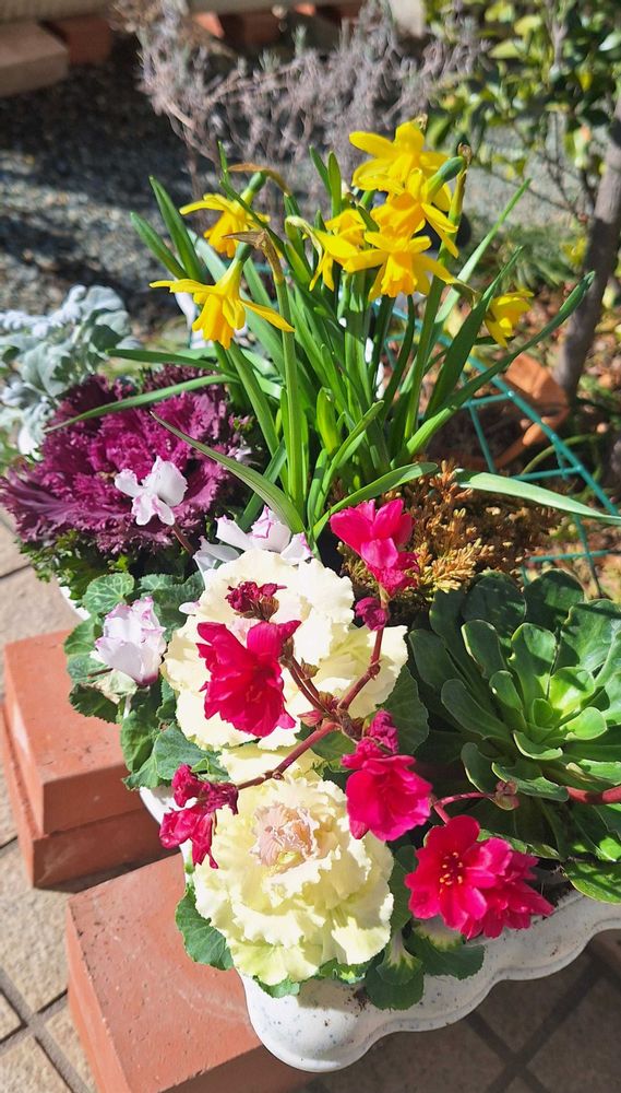 HCで可愛らしい水仙と大好きな赤いレウイシアを見つけ寂しくなったプランターに追加しました❤️