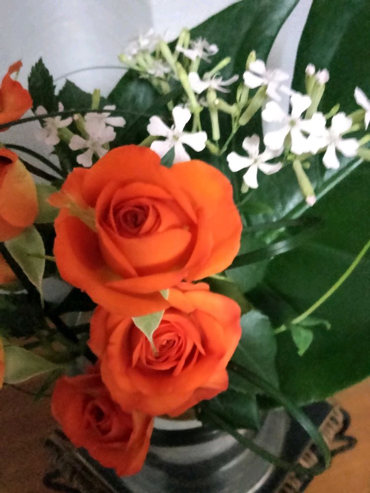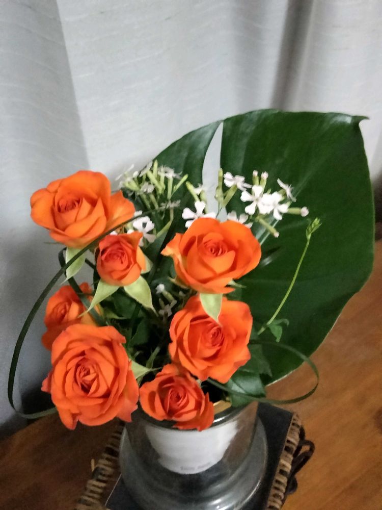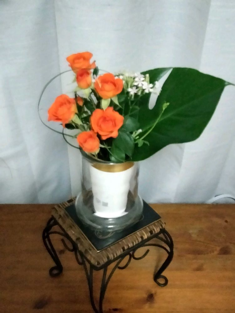 庭のジャノ長ヒゲを足してアレンジ🧡🌿💚
