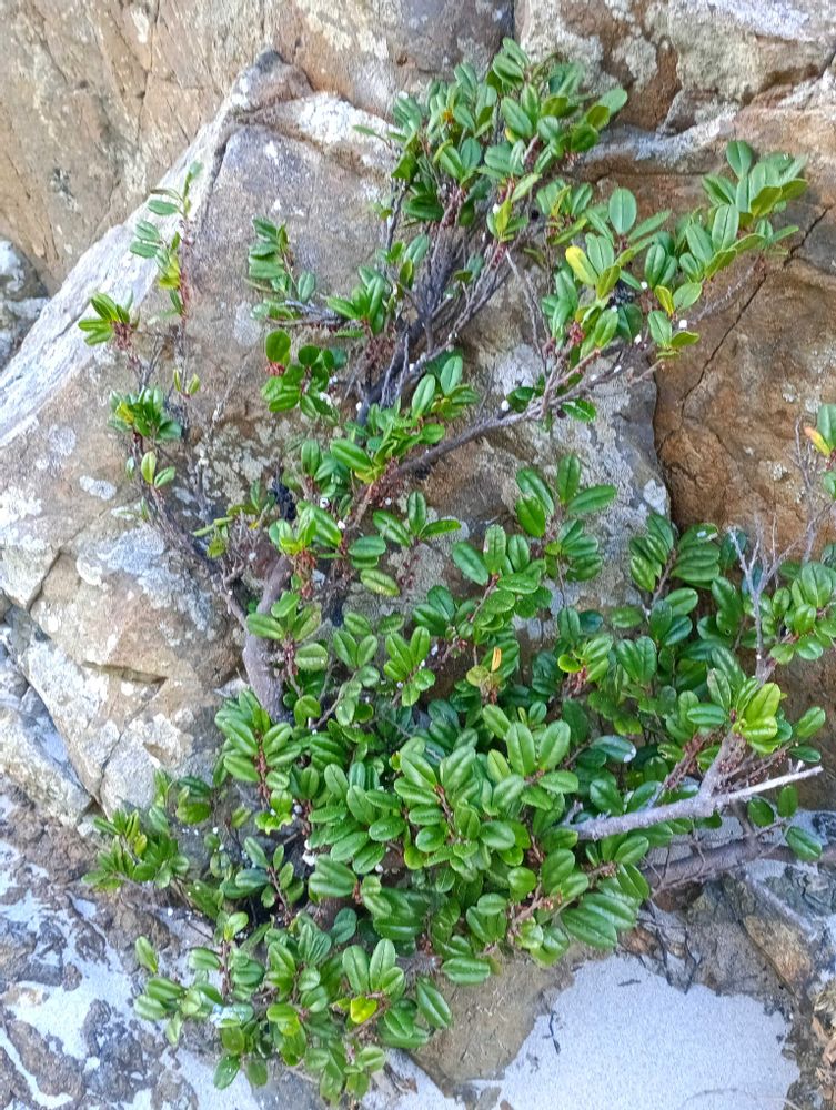 ①② 海辺の岩の間に根を下ろして、這うようにして、潮風や乾燥にも耐えて生きているハマヒサカキ