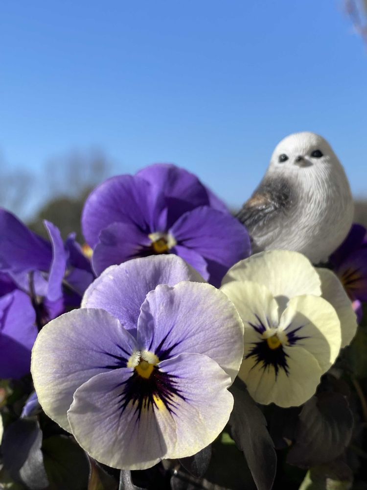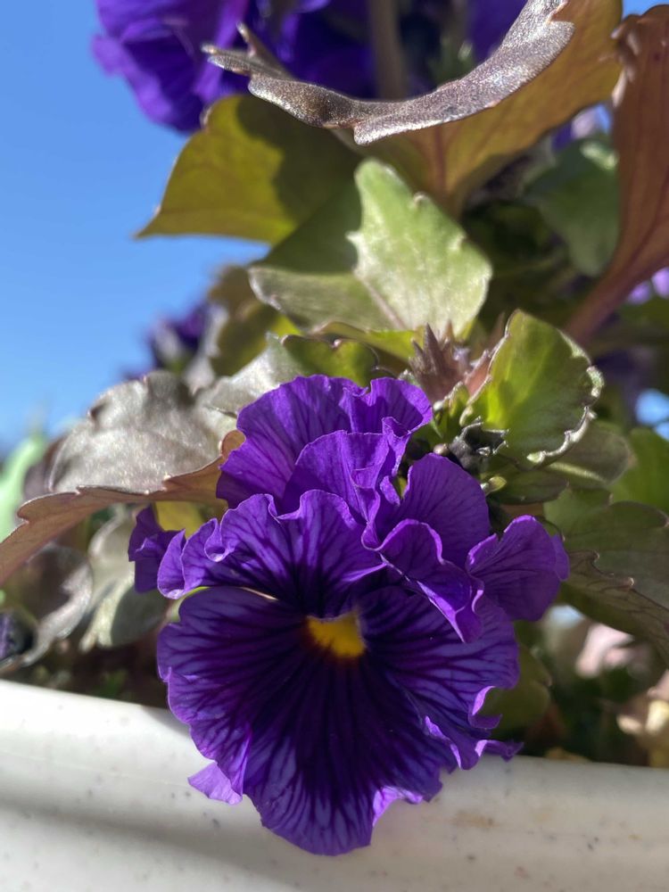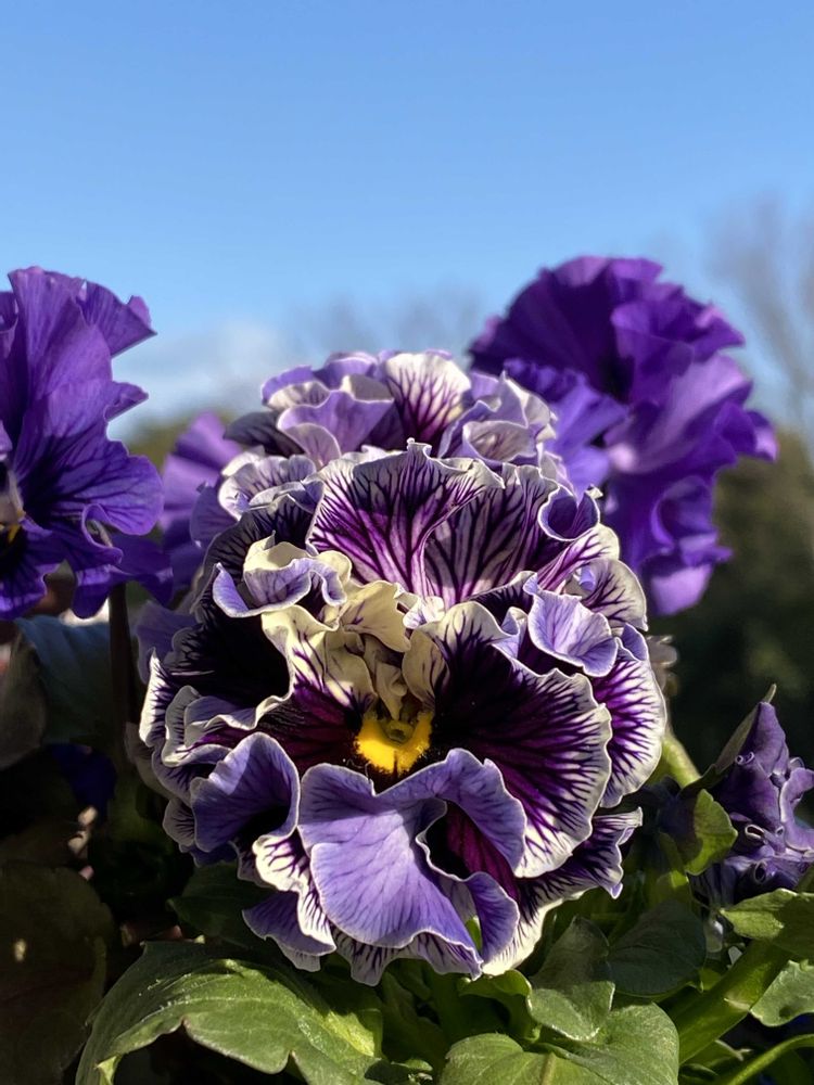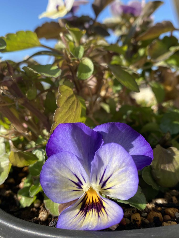 可愛い子ちゃんとビオラ、綺麗ね。青空バックで、美しいよね。💙💜🤍💙💜🤍
