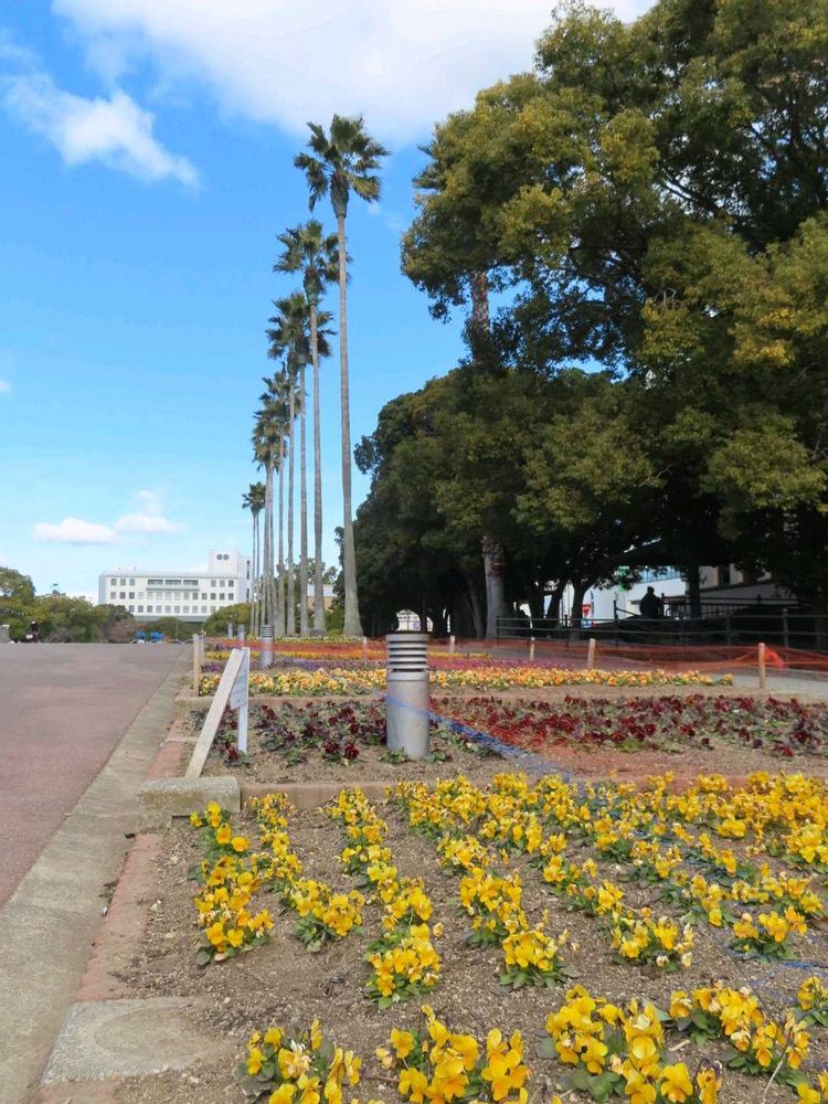 ②ヤシ並木とパンジー花壇と青空(徳島市藍場浜公園)