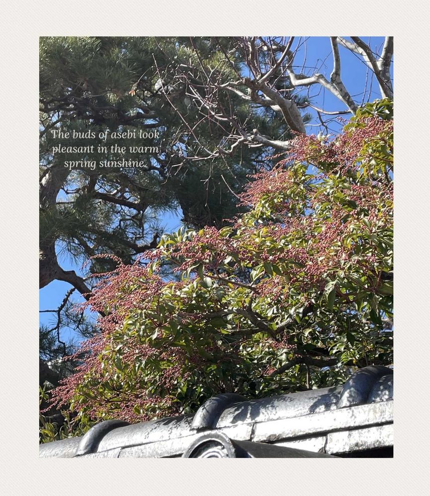 そんな中、今日のお花のアセビを撮りに出かけてきました。黒い瓦屋根に映えるアセビの赤い蕾。