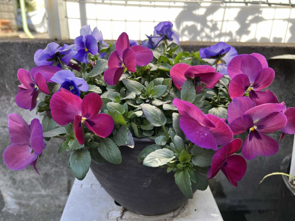 ノーブランドのパンジービオラの3色植えのはずが、2色にしか見えない😅そして、どの子がパンジーでどの子がビオラかすらも不明😅それ位当初からモリモリ咲いてくれています❣️やはり、花付きや苗ポットの後ろを見て根回り確認したり(抜けないからね💦)、株元のしっかりさの3点チェックは重要ですね〜。