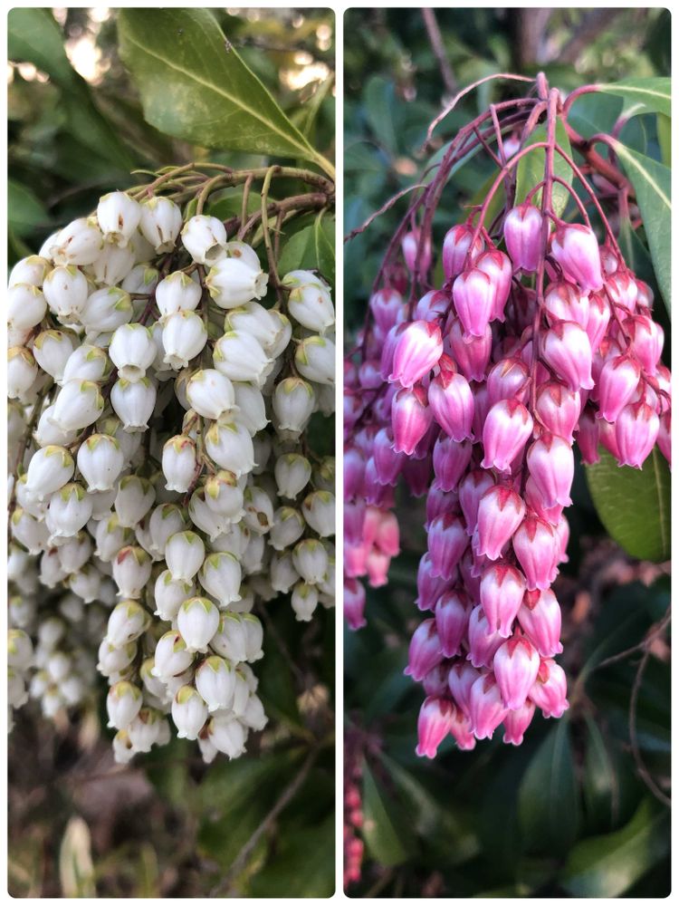 実家の近くに散歩に行った帰りに見た白いアセビとピンクのアセビ。