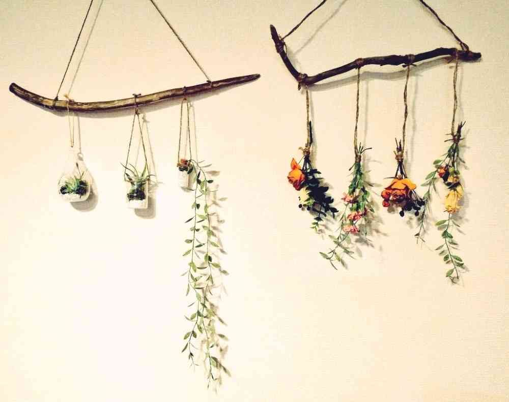 流木にドライフラワーやビーカー、フラスコに入れたエアプランツ、苔などを吊るしました。