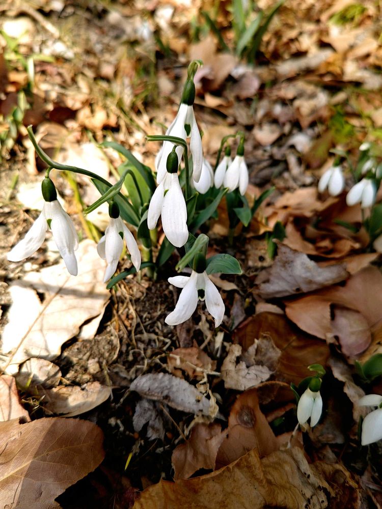 厚い落ち葉の🍂の布団の中から、春を告げるように芽を出し花を咲かせるスノードロップ、春の妖精🧚。