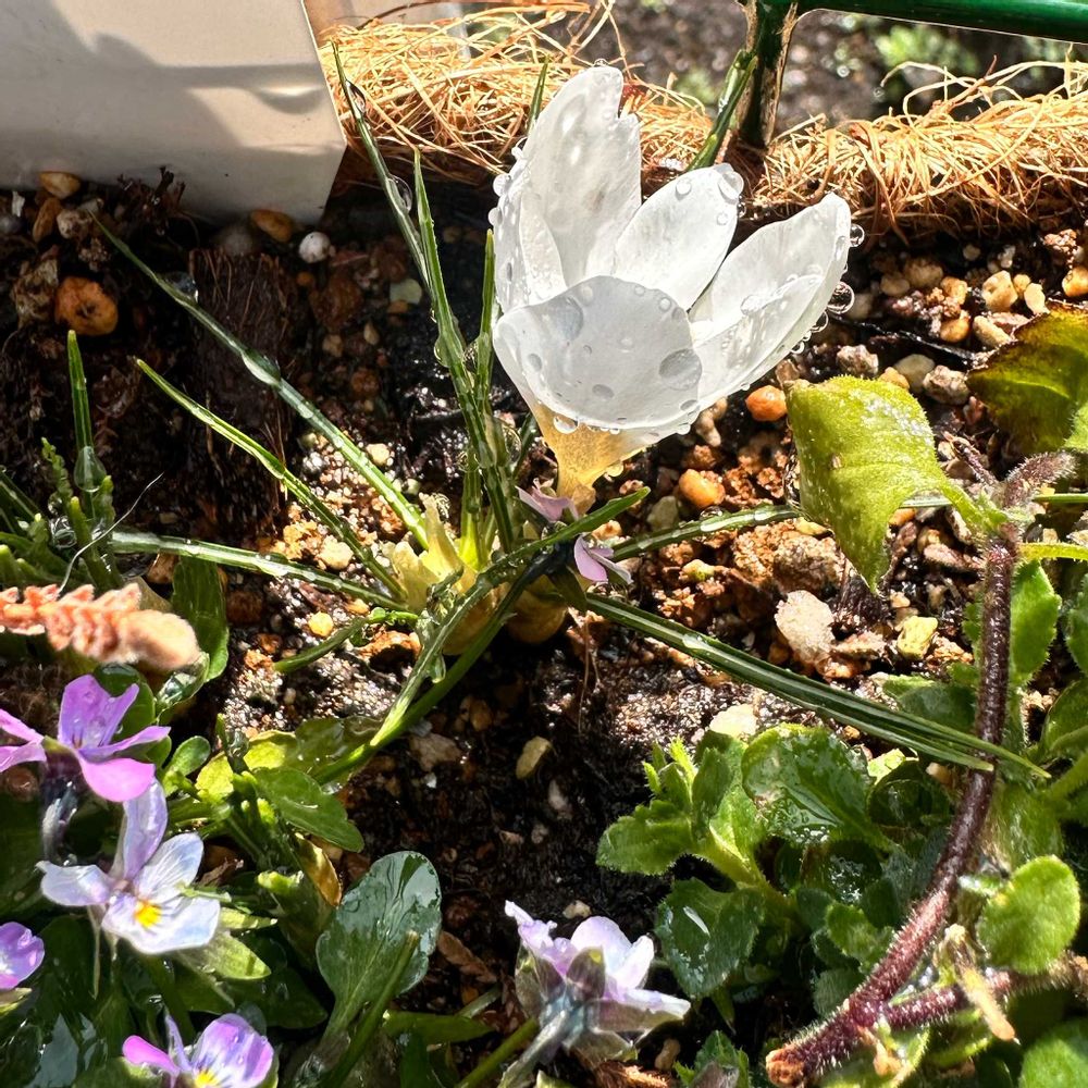 先日の暖かい日に今年1番目のクロッカスが咲いていた。ここに入れた覚えはないのだけど植え付けの時に土に混ざって入ったのかな