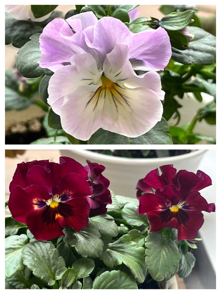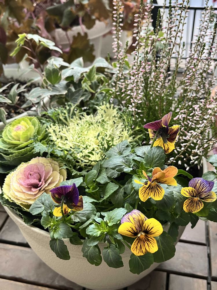こんにちは🎀また寒波がやって来て曇ってるし😓強風注意報が出てます😳 1️⃣去年12月に作った寄せ植え✨ビオラのタイガーアイ🌟ずっと咲いていて😊カルーナ初めて育てますが丈夫ですね〜🎶葉牡丹も元気です😃 2️⃣シエルブリエ✨どちらもいい色しています❣️