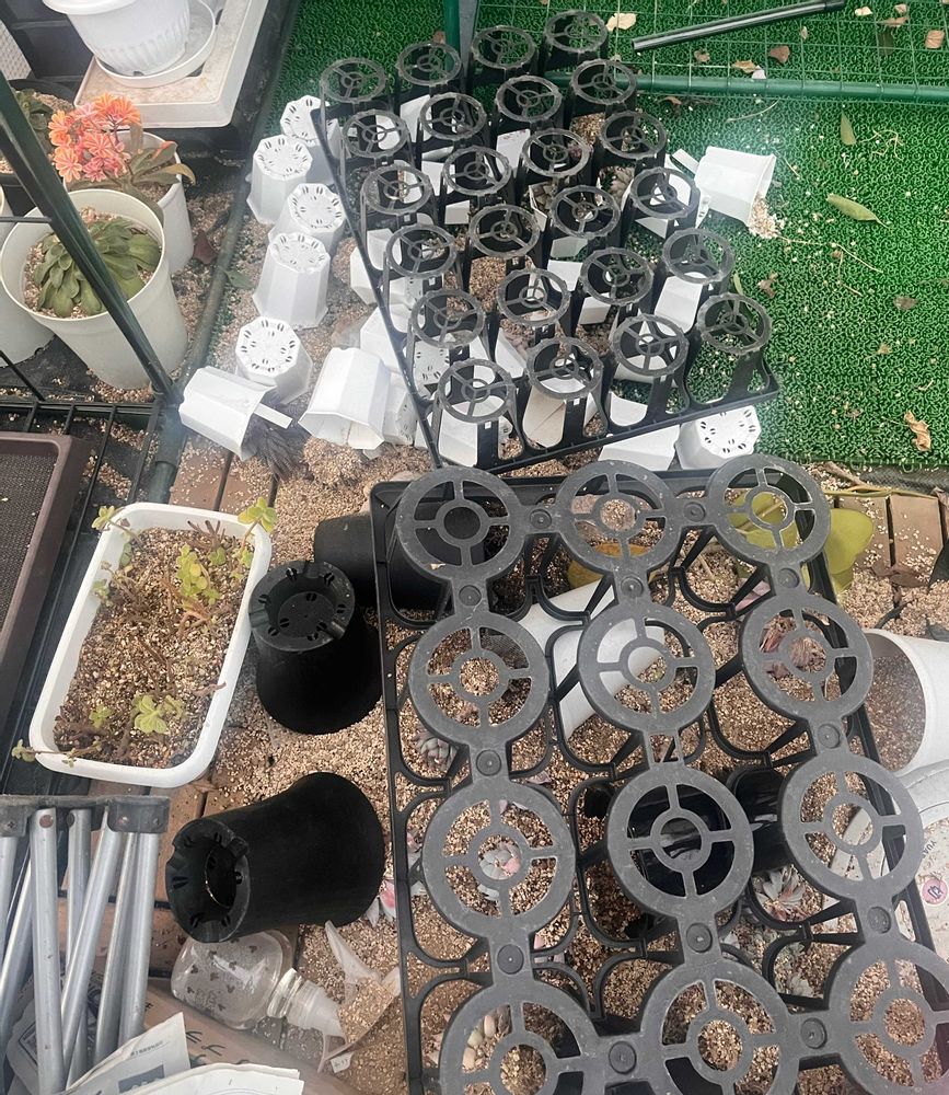 強風にハウスが煽られ、ハウス内の棚が揺らされた結果、棚上のトレーに配置されていた多肉達、約40鉢落下…。