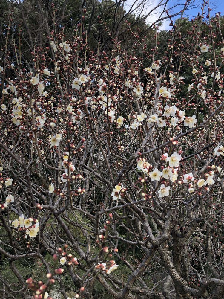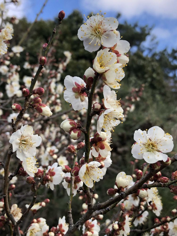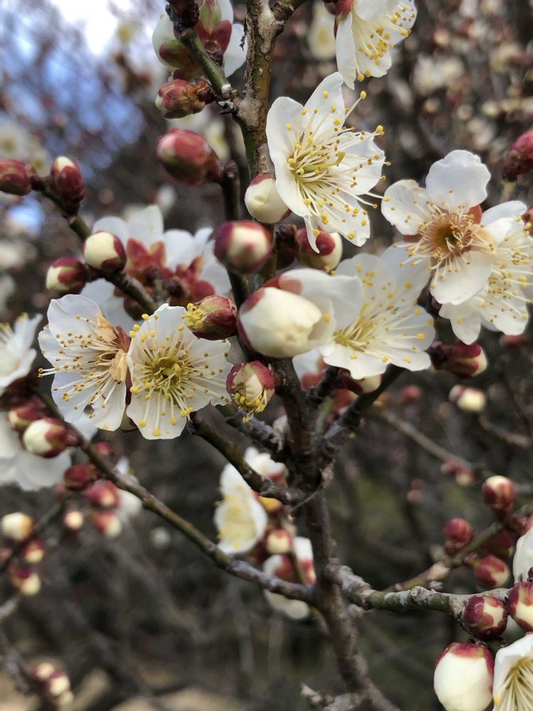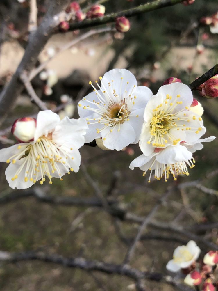 ウメの中で最初にお花が開いて、今は満開です。真っ白なウメ「冬至」をパチリ!🌼😊😄🌞✌️
