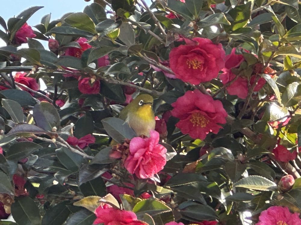 山茶花の花🌺に蜜を求めて来るメジロさん🐦⬛