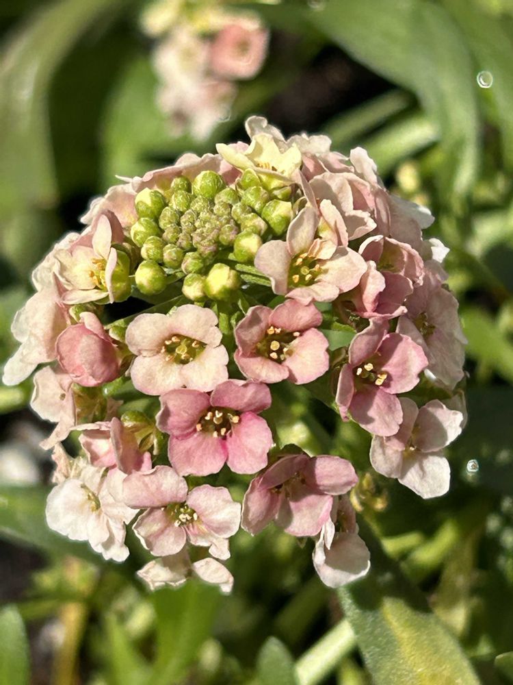 ②庭の梅はまだ硬い蕾、淡いピンクアリッサムがお先に🩷