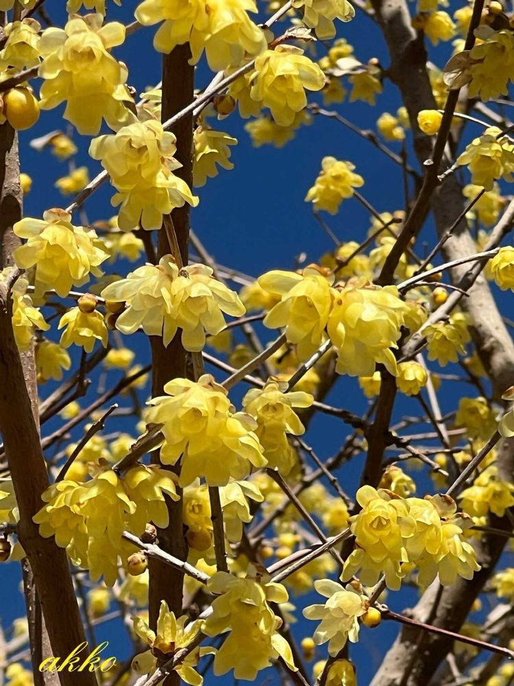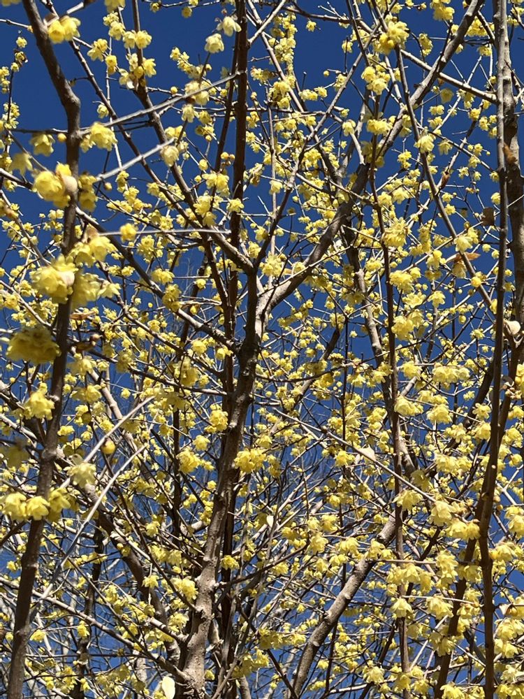 わぁ、真っ青な空にピカピカ光る黄色の蝋梅。美しいですね~