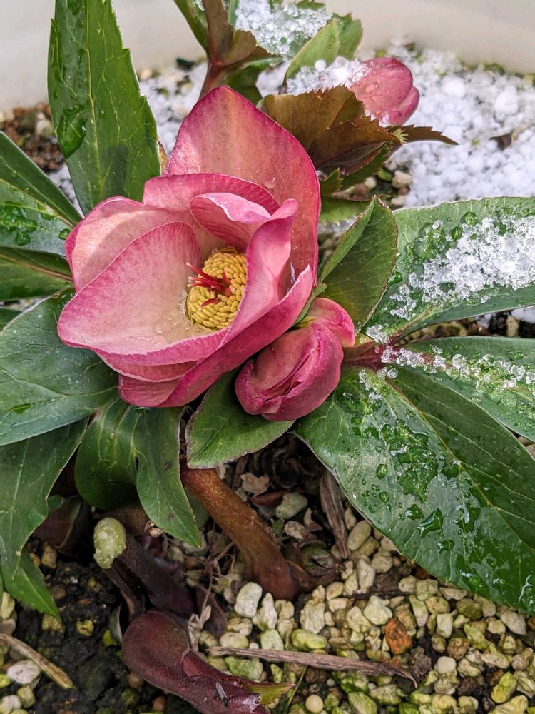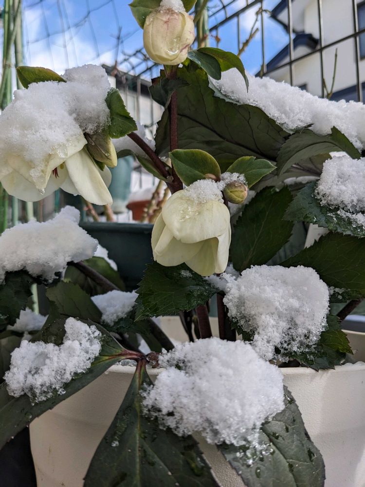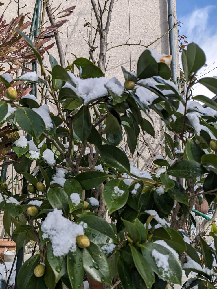 開花を始めたクリスマスローズと、蕾がふくらんできた椿も雪❄をかぶっています