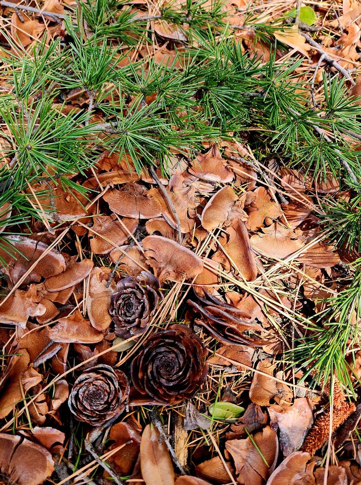 太いヒマラヤスギの株元に、かた焼き🍘の欠片みたいなシダーローズの鱗片がうず高く掃き集められていました。