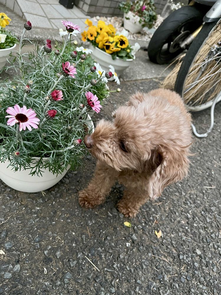 マーガレットと何かのハイブリッド新品種⁇かわいい🩷長いこと咲いてくれたら嬉しいね🥰ナッツちゃん🐶も匂い嗅いでる相変わらず可愛いね🐾💕