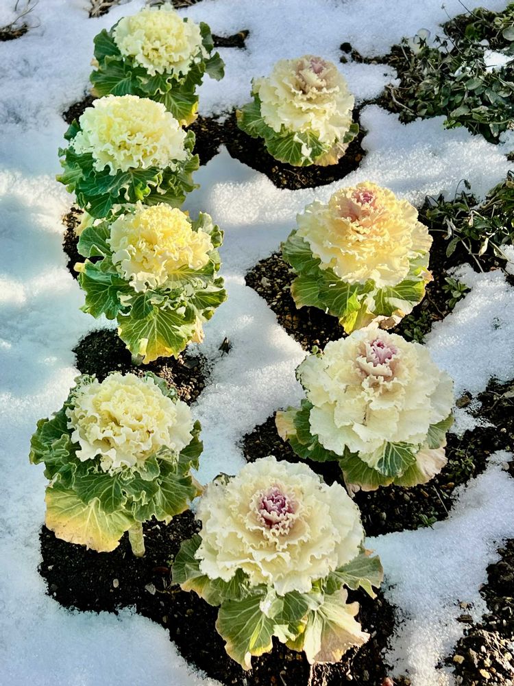 クリニックのまだ雪のある花壇に白い葉牡丹が綺麗❣️
