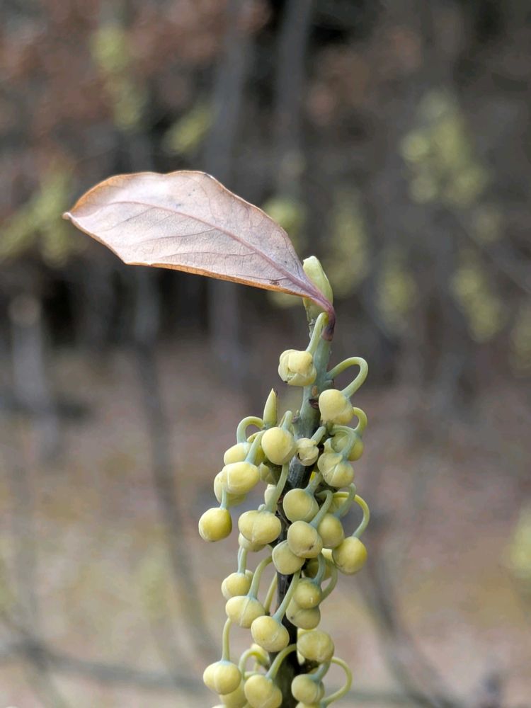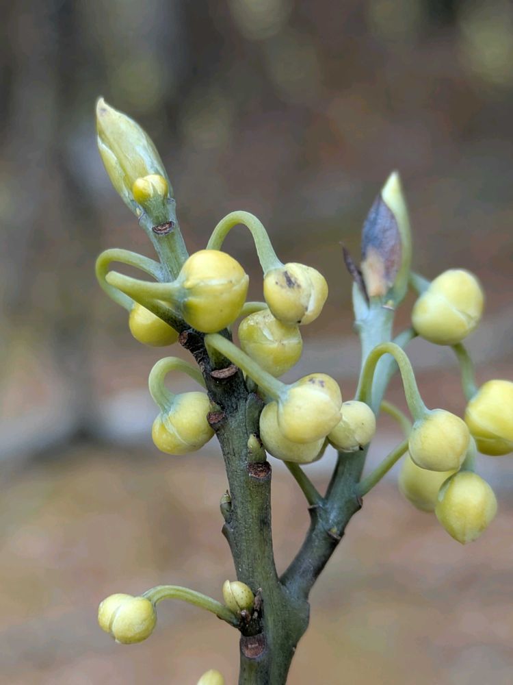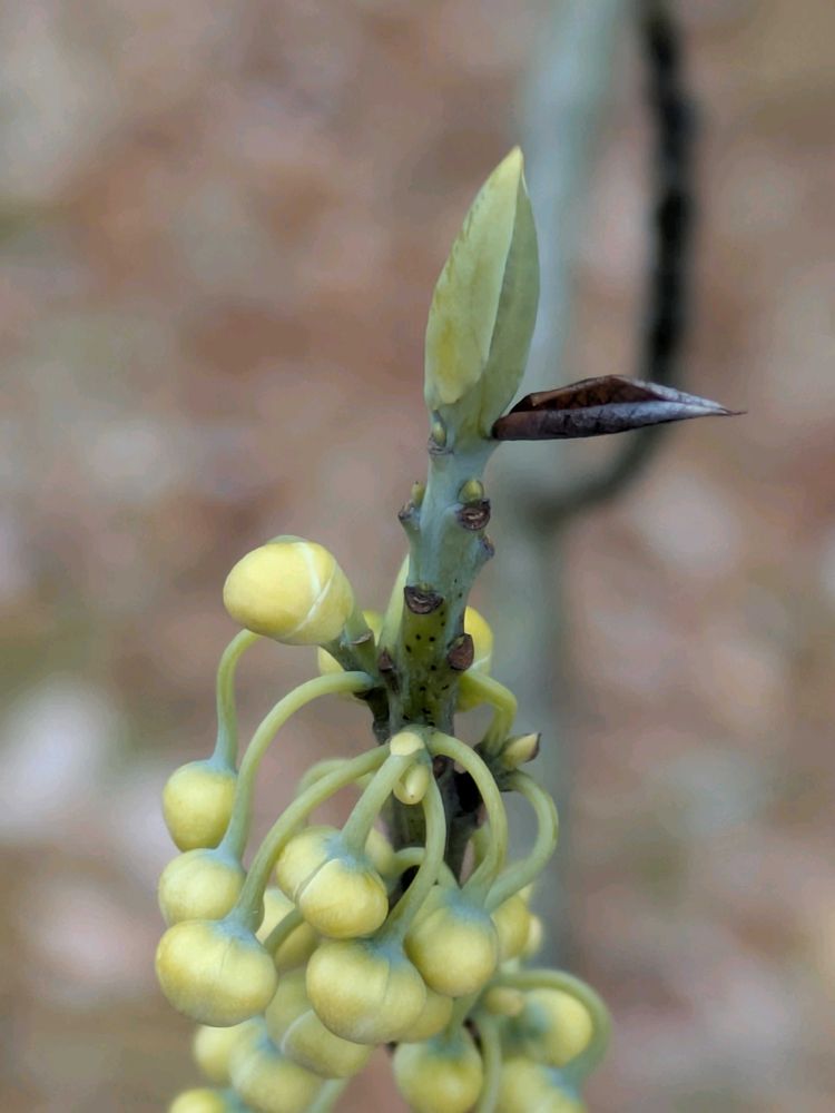 雑木林の一角がぼんやりと黄色くなっている🟡 総苞片が青緑から黄色が少し強くなってきた 金曜日の蕾たち🏷