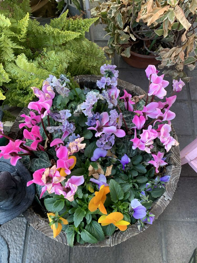 これは、ビオラとガーデンシクラメンとの寄せ植えです。