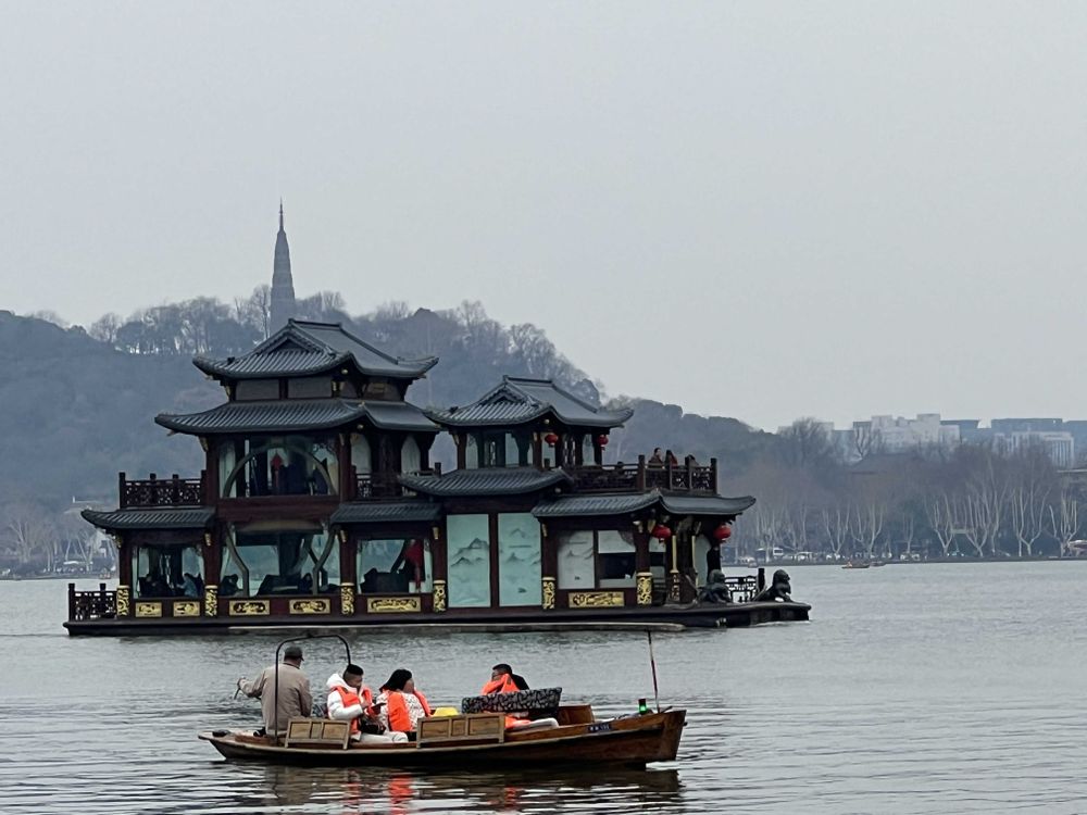 3枚目の写真は、山の上に塔が建っていて、その前にたまたま、西湖に浮かぶ遊覧船がいます。
