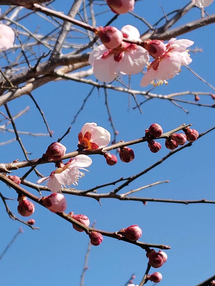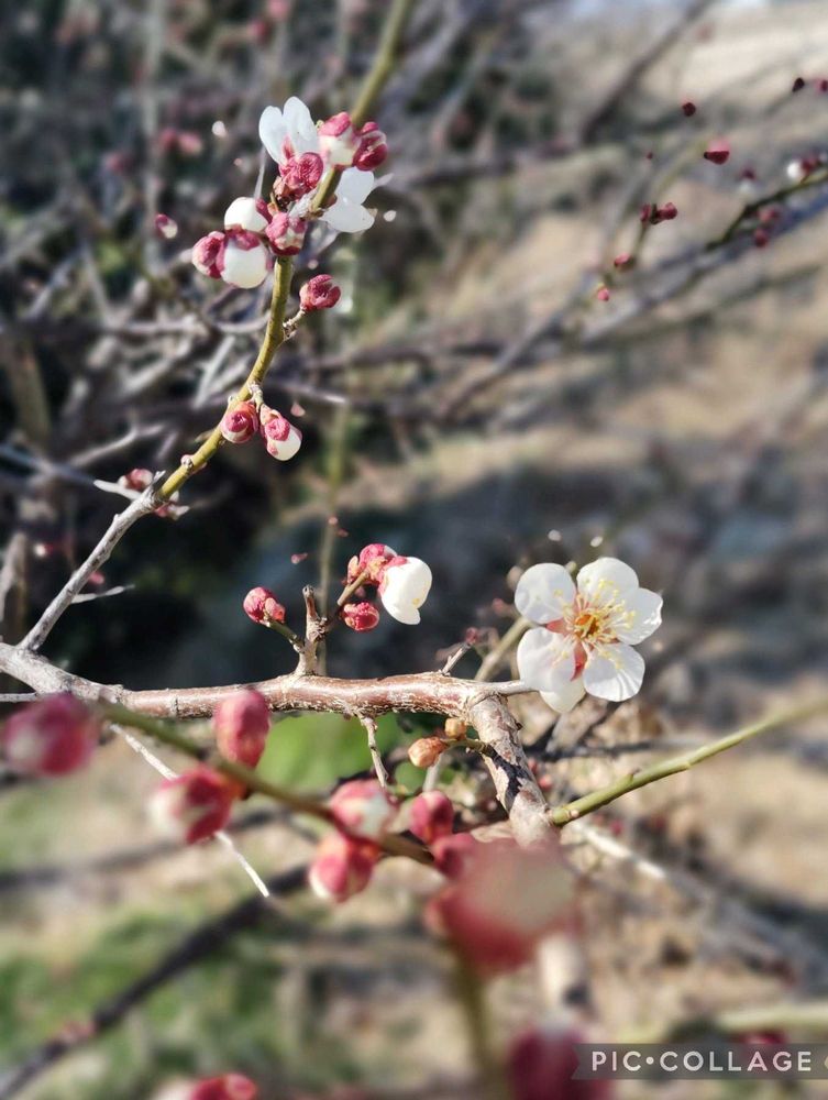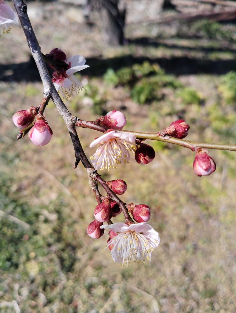 クリスマスローズの華やぎの上には、春の訪れを伝えてくれる梅の華やぎ