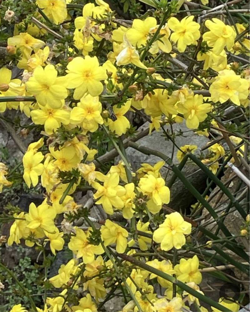 モクセイ科の植物で,花は黄色🟡の一重、枝はつる性で垂れ下がる🙌