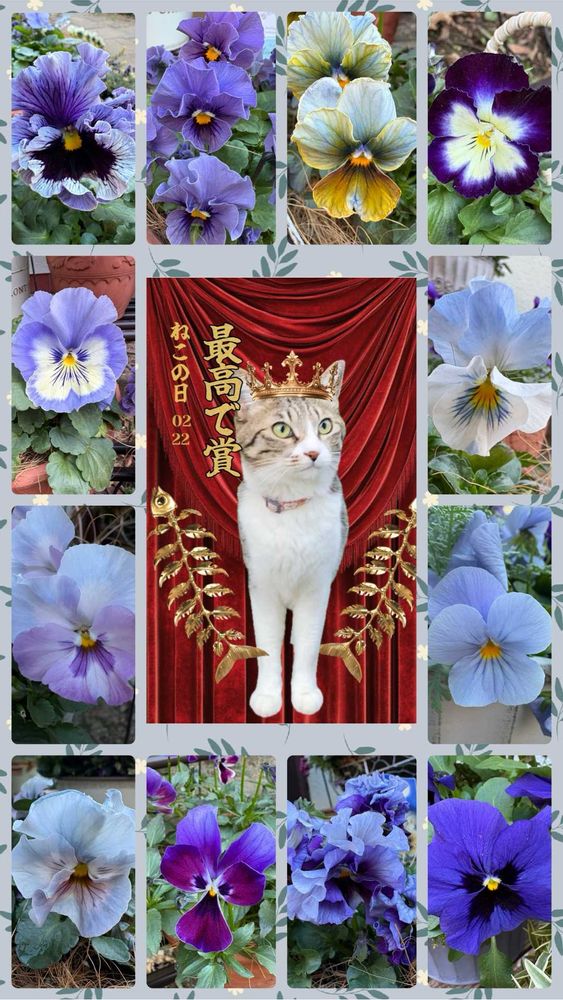 我が家の青グループのパンジービオラ💜🩵と共に、何かに受賞した、かぼす🐈です😆🐈💜🩵