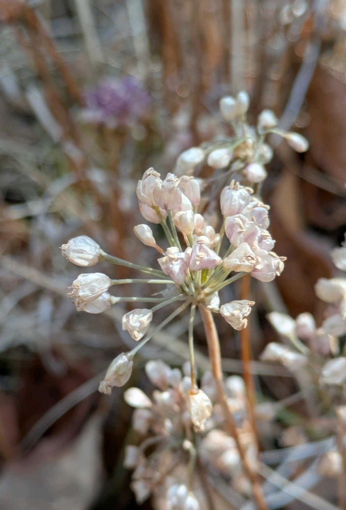 冬枯れですっかり色が抜けた白い花序は種子も落ちて‥ と思ったら、群落の中にまだ色か残る株に出会う💜