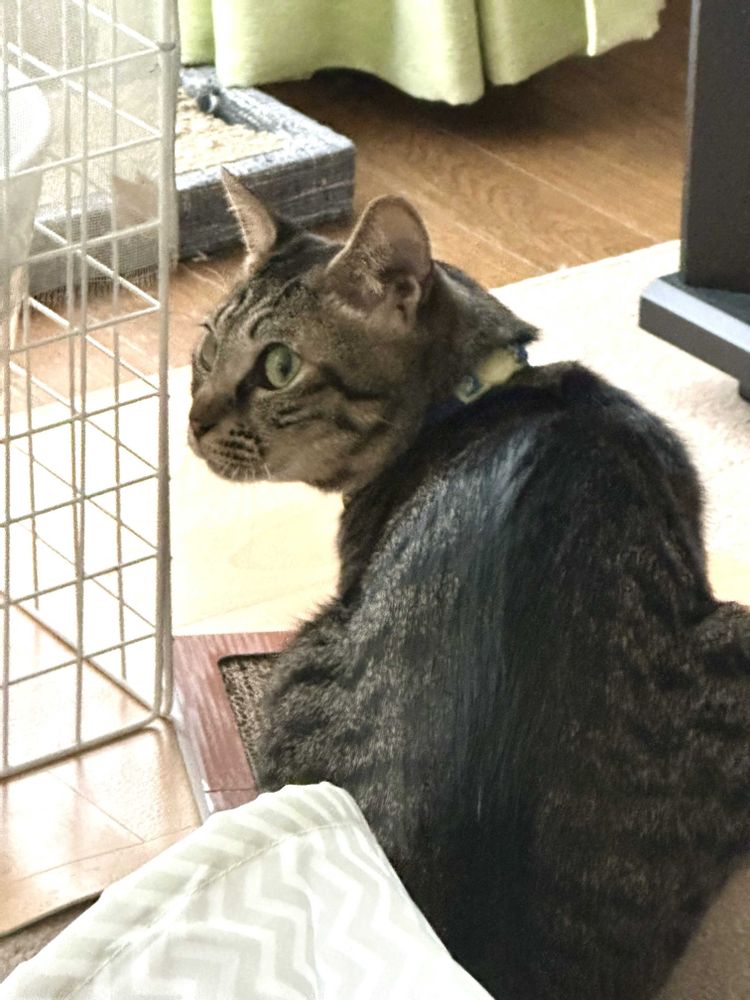 夫が何やらガサゴソしていたのを凝視しているチュラで参加します🐱🎶🎶
