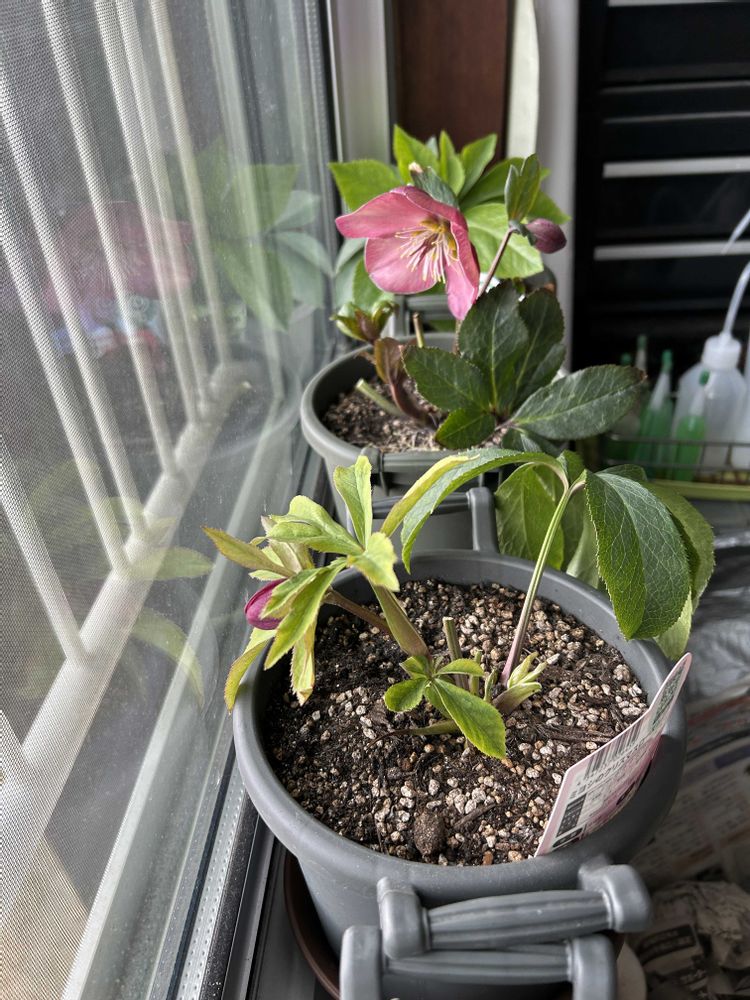 ストロベリームーン🍓2個目の花芽をつけました。隣のエレガンスグレープ🍇も花芽を伸ばしてきました。😊寒波もラストスパートみたいですね。クリスマスローズたちも窓辺で仲良く待機中。もう一踏ん張りですね。fight❣️