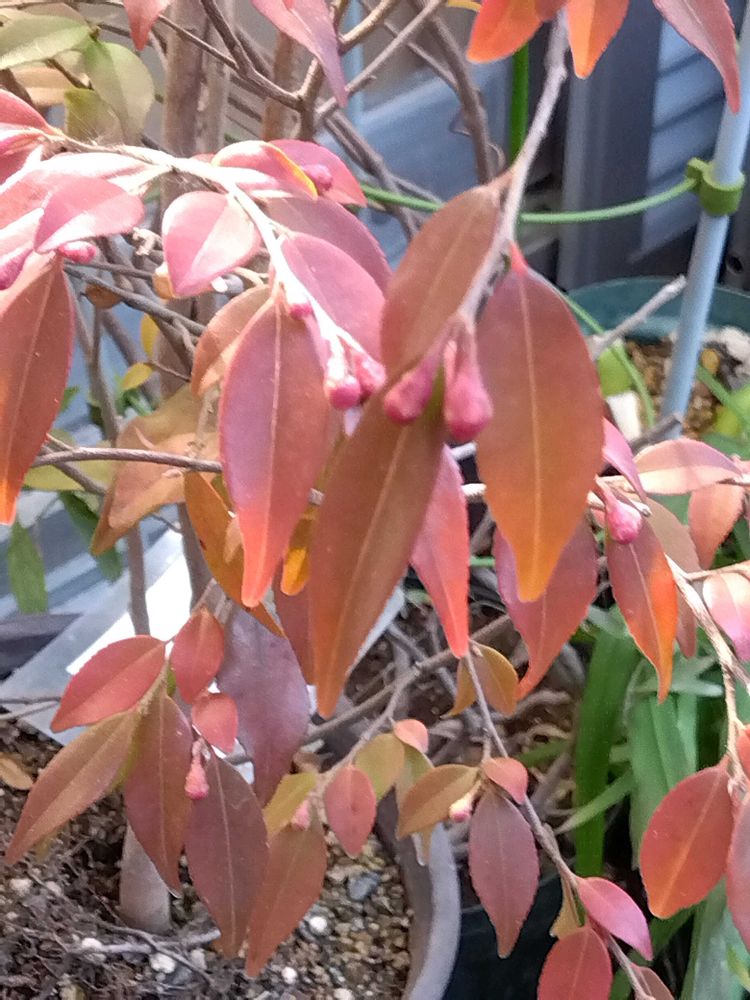小さな蕾エリナ、葉は紅葉しています🎵花開く頃は緑の葉に成るかな⁉️