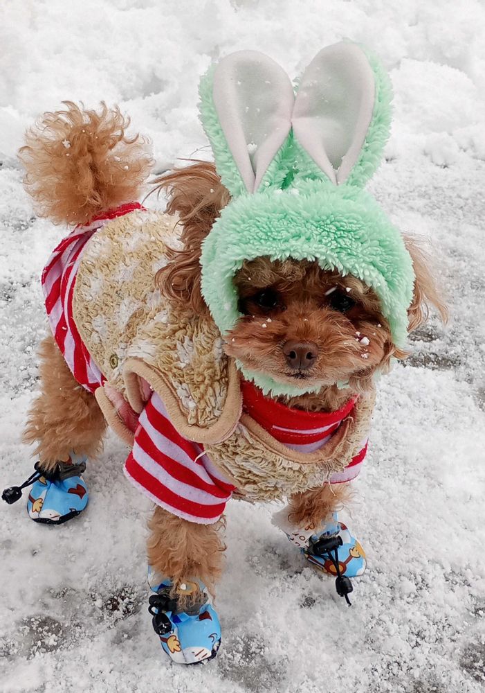 8歳にして初🔰『犬靴』で玄関先デビュー。家の中ではぎこちない歩き方🐾➿🐾❓も、久しぶりの外🎶💕で上手に走り💨、投げられた雪玉をペロペロ🤭楽しげでした👌 その後は、🏠️ファンヒーターの前でHot Dog🐶♨️になっていたのは、言うまでもナク😂でした(笑)