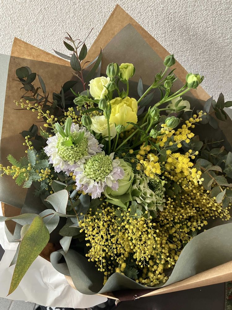 いつもの花屋さんに作っていただいたブーケ💐「男性ですか、女性ですか」と尋ねられたので🙍♂。