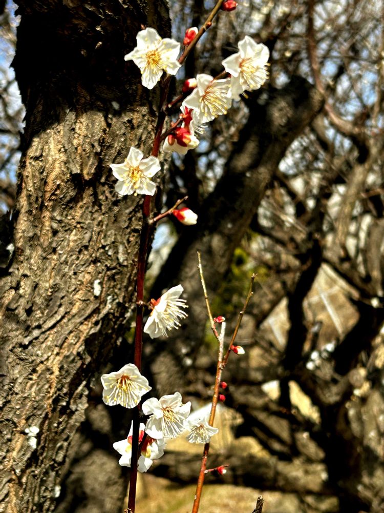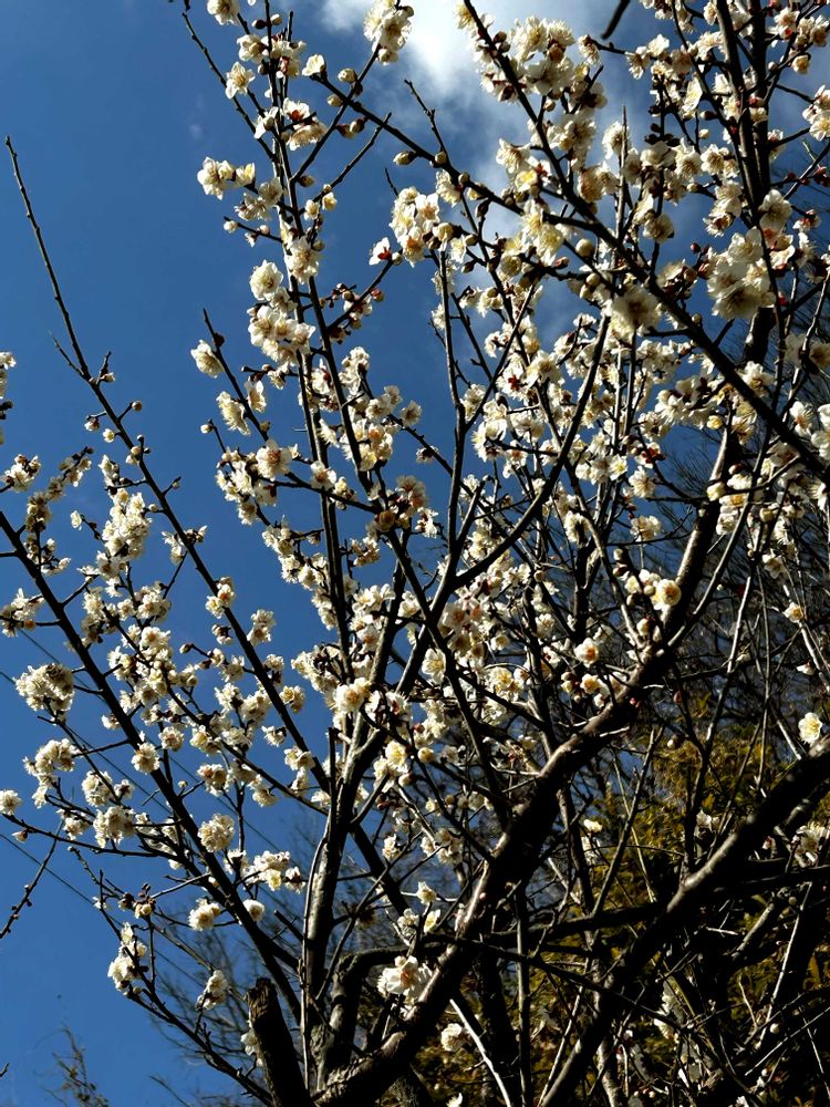 梅畑で満開の梅の木を見上げていると、雪のように見えてしばらく佇んでいたら、本物の雪が降ってきました❄️