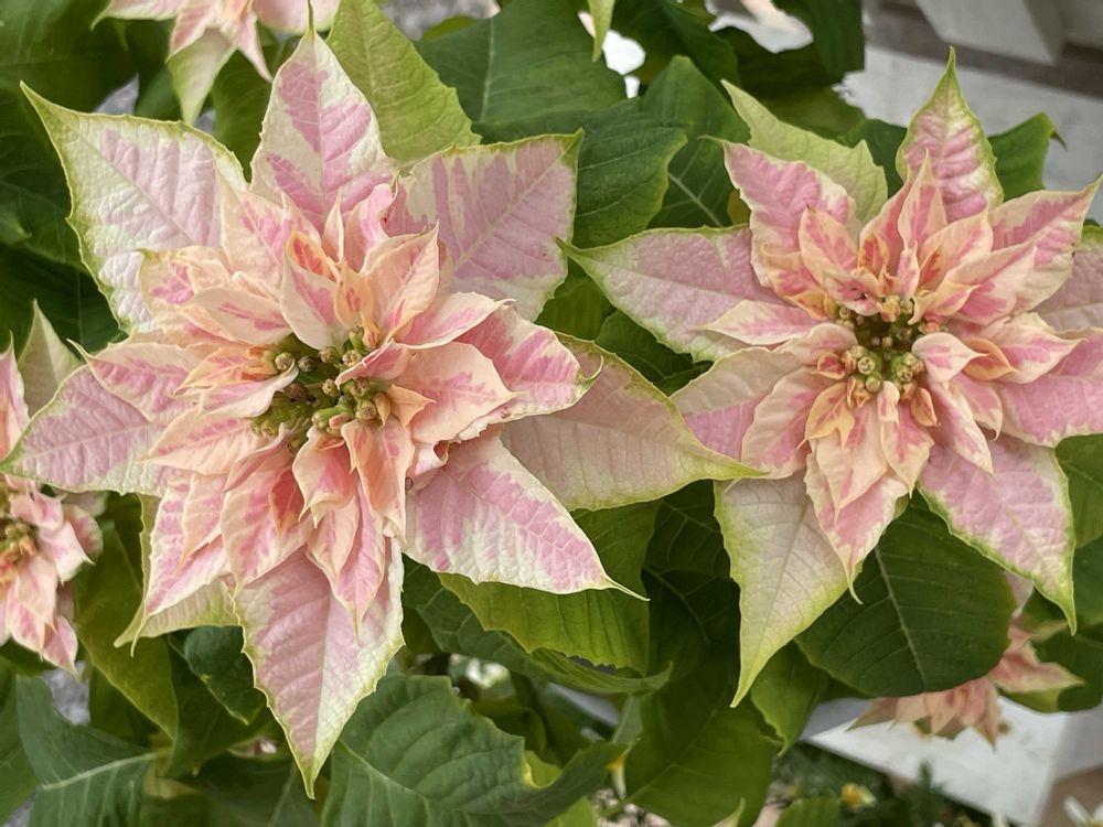 プリンセチアは、赤い方はだいぶ淋しい感じだけど、ロゼマーブルは長持ちしてます!!お手入れらしきものは、たまにお水あげてるだけですよ😅