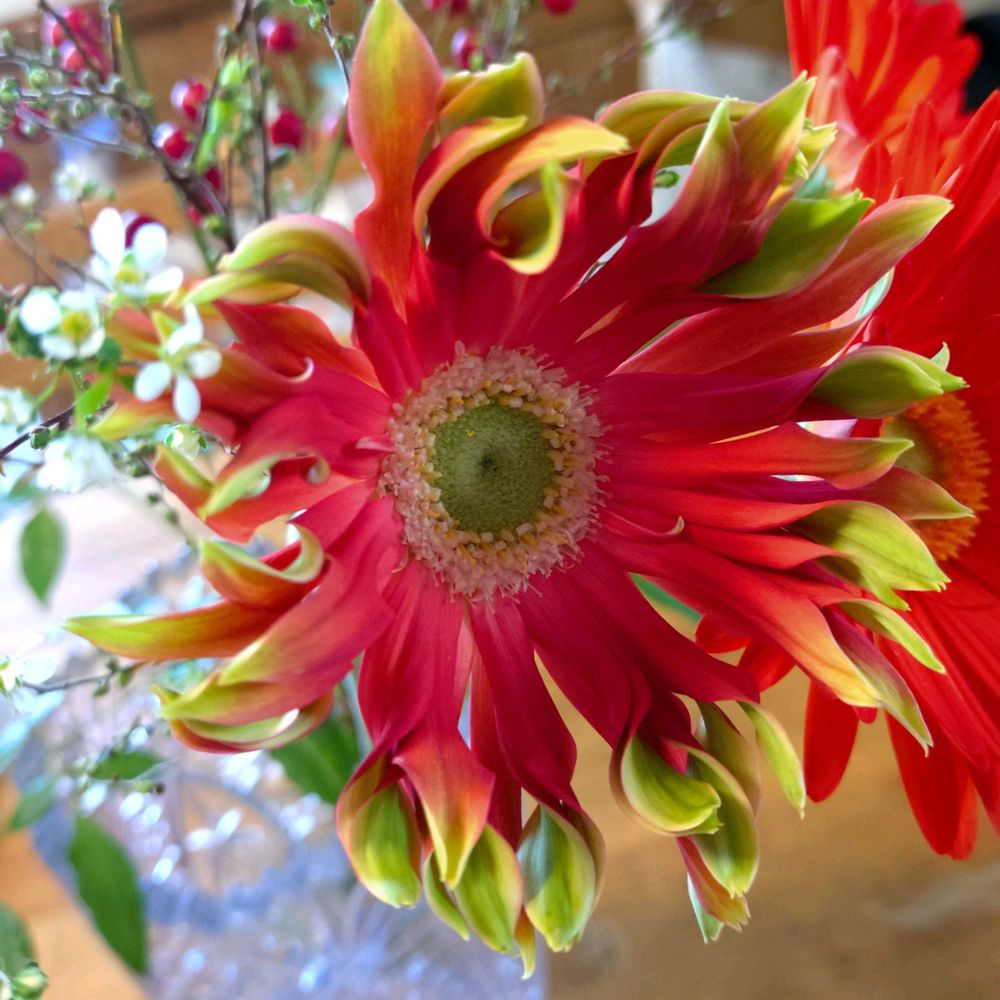 ガーベラはよく見かけるのとはまた違った雰囲気のある一輪が花びらが変わっていて素敵です🧡💚