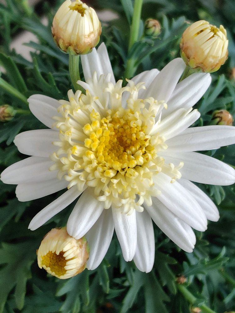 真っ白な舌状花、管状花の集まる中心部は淡いバニラホワイトのアネモネ咲き…お花の中にちっちゃなお花が咲いてるようでめちゃ可愛いです🥰