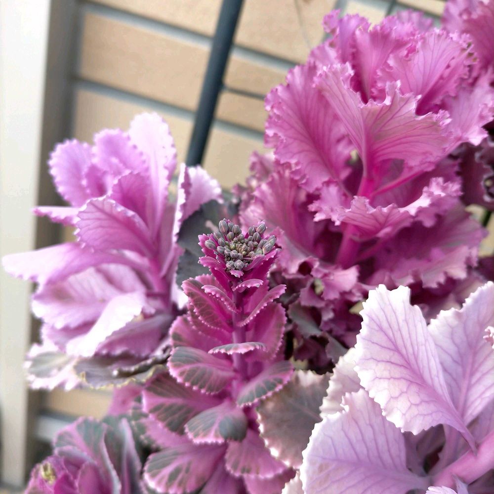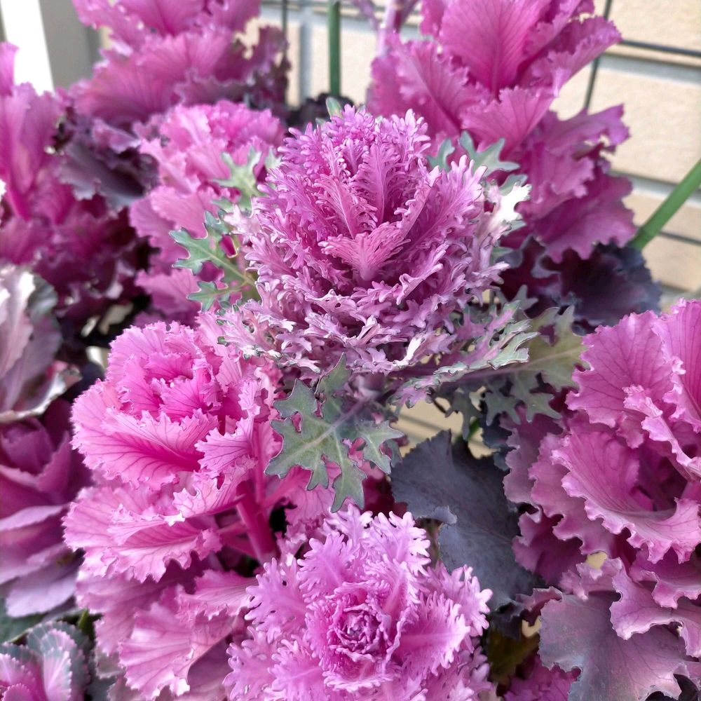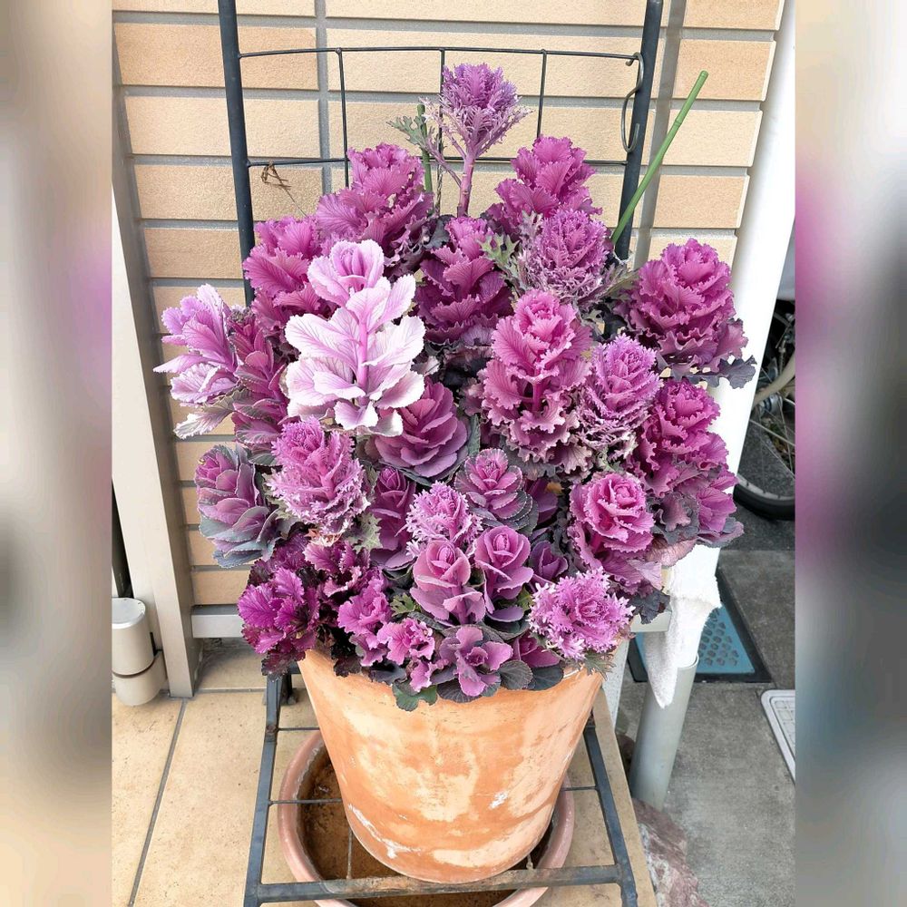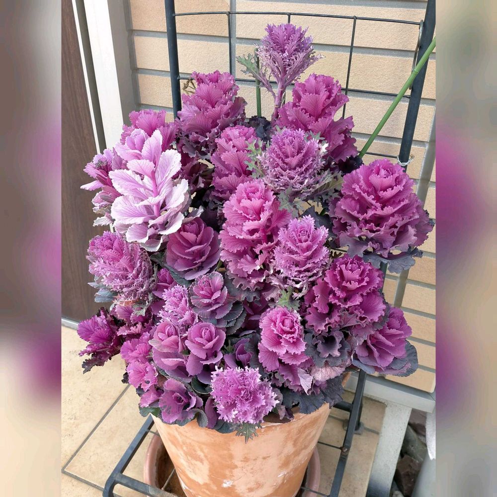 今年は紫葉牡丹だけで寄せ植えてみまして、植え付け当初は地味だったのですが、色付きがピークに達したらかなりゴージャスになりました😆💕