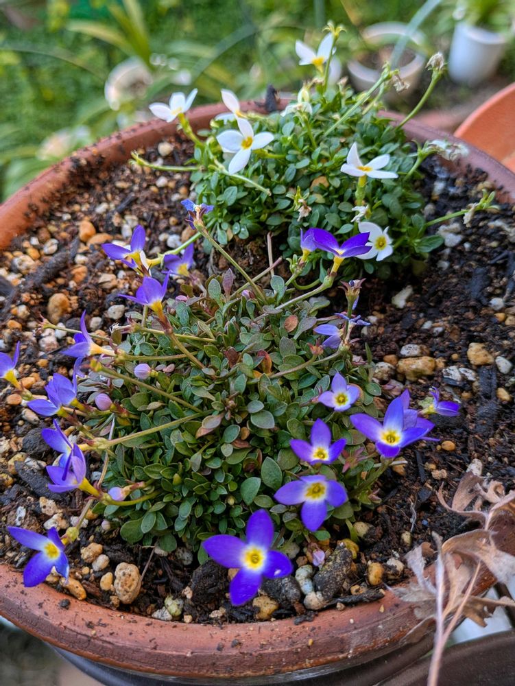 ヒナソウの、水色を見つけました。以前、紫と白だけ買ったけど、今回は別の店で、水色だけ売られていました。近くの、ガーデンシクラメンも、いっしょに。