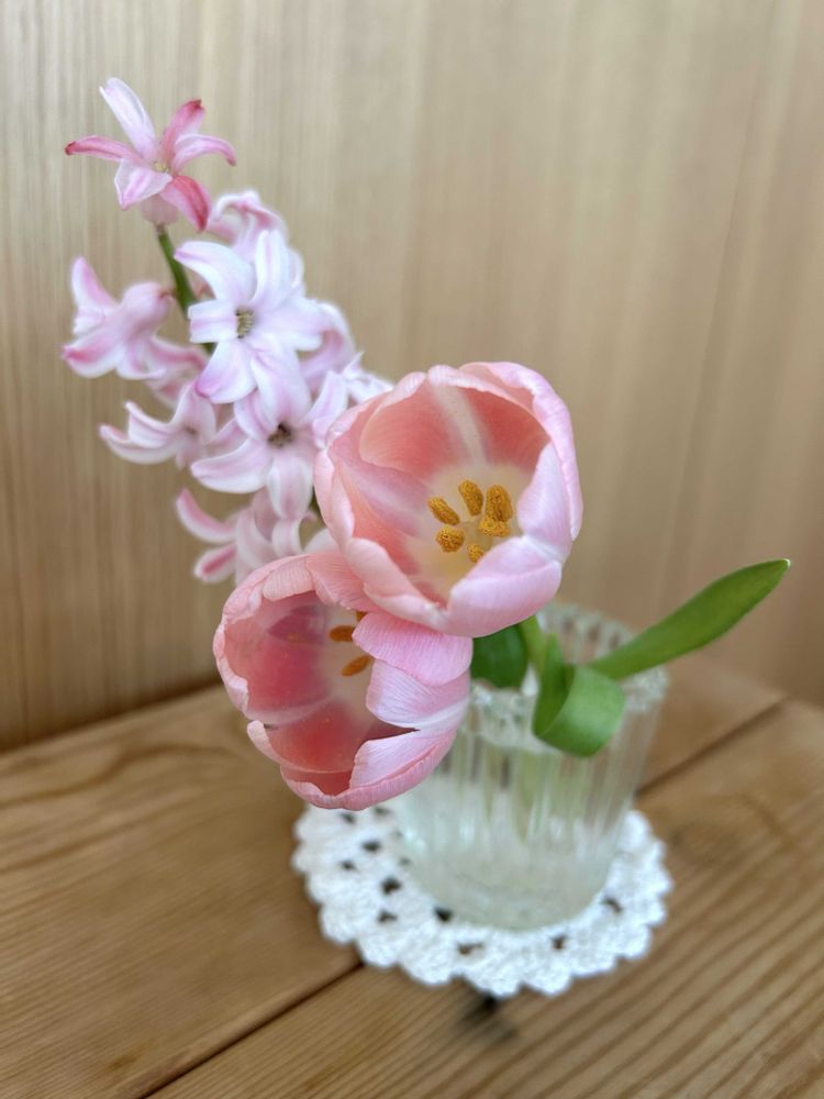 残念ながら折れてしまったヒヤシンスとチューリップを小さな花瓶に🪻🌷