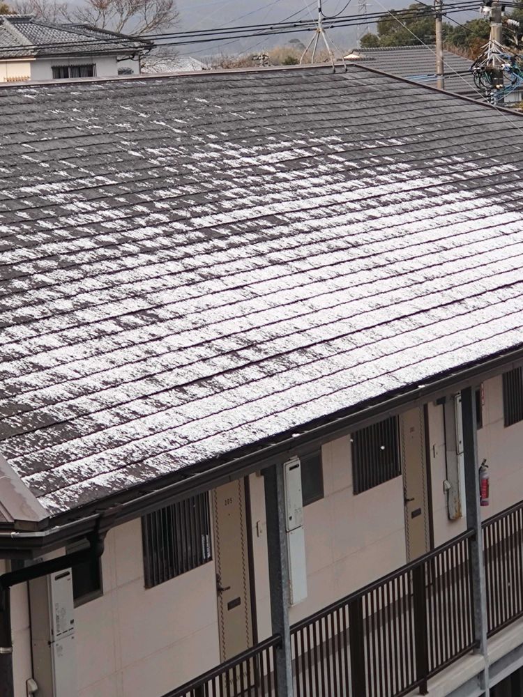 2枚目は、我が家から見える近くなアパートの屋根。うっすらと積もっています。