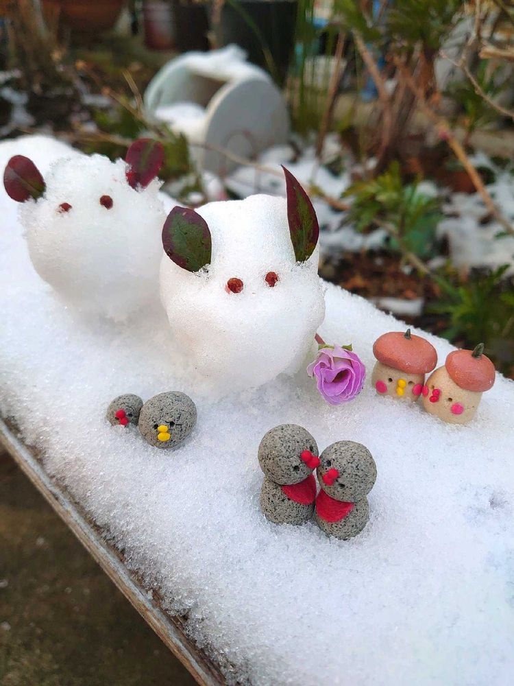 こんばんは~今日は温かいけど雪🐰作れる程なのね~🥶💦でもカワユス〜🥰👌