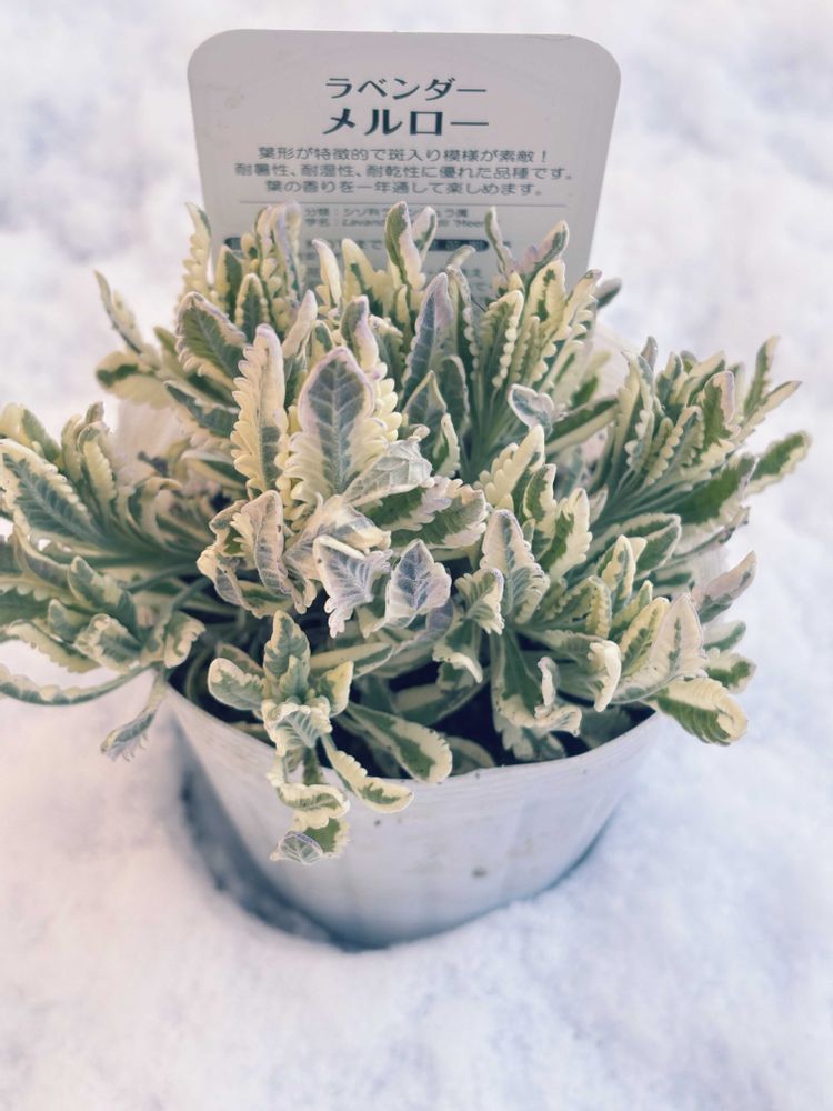 雪の中に置かれたラベンダーメルローさん🌿✨🌿素敵なpicで🏷️2のつく日は斑入りの日