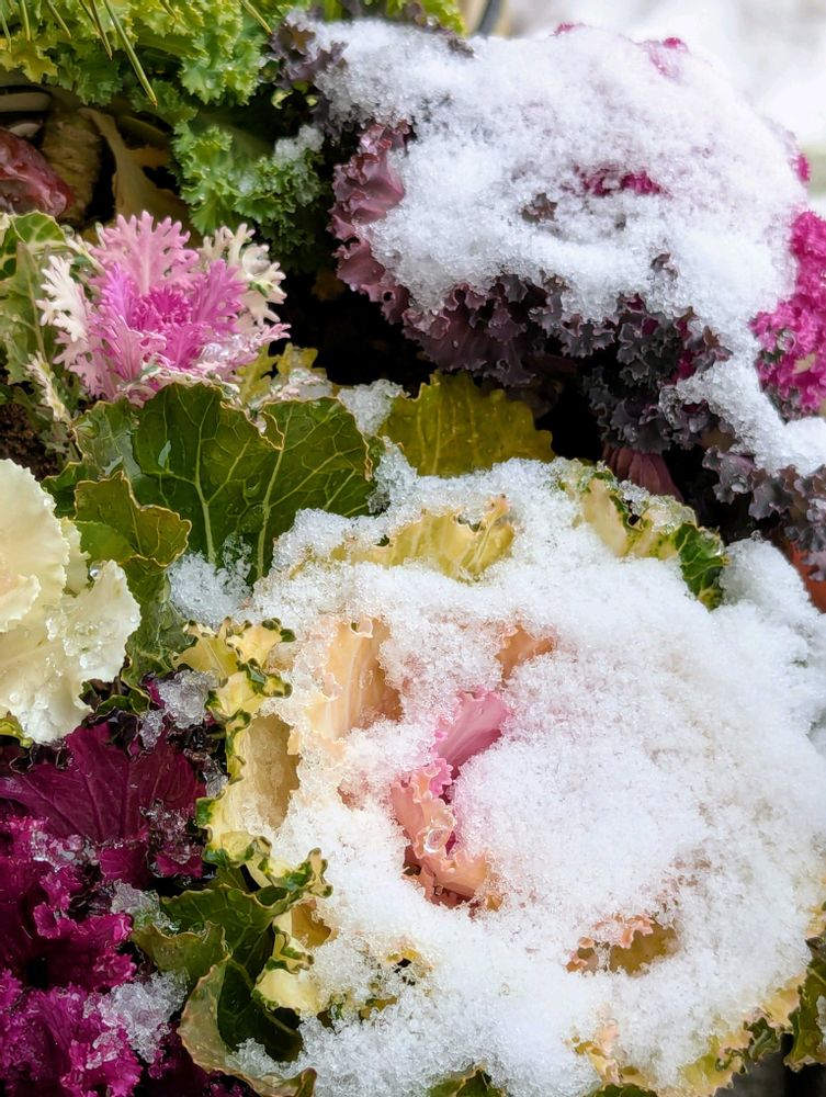夜中に雪が舞ったのか葉牡丹に雪が…❄️