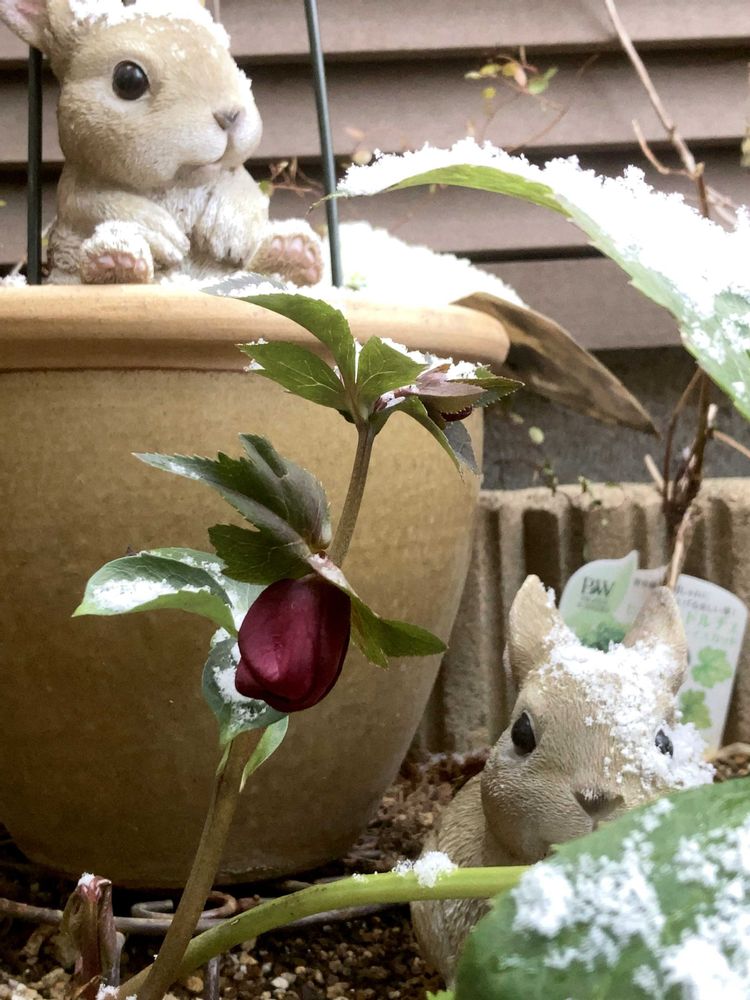 1️⃣和風花壇の赤いクリスマスローズとうさぎ🐰まだ小さな株ですが楽しみなクリローさんです♪