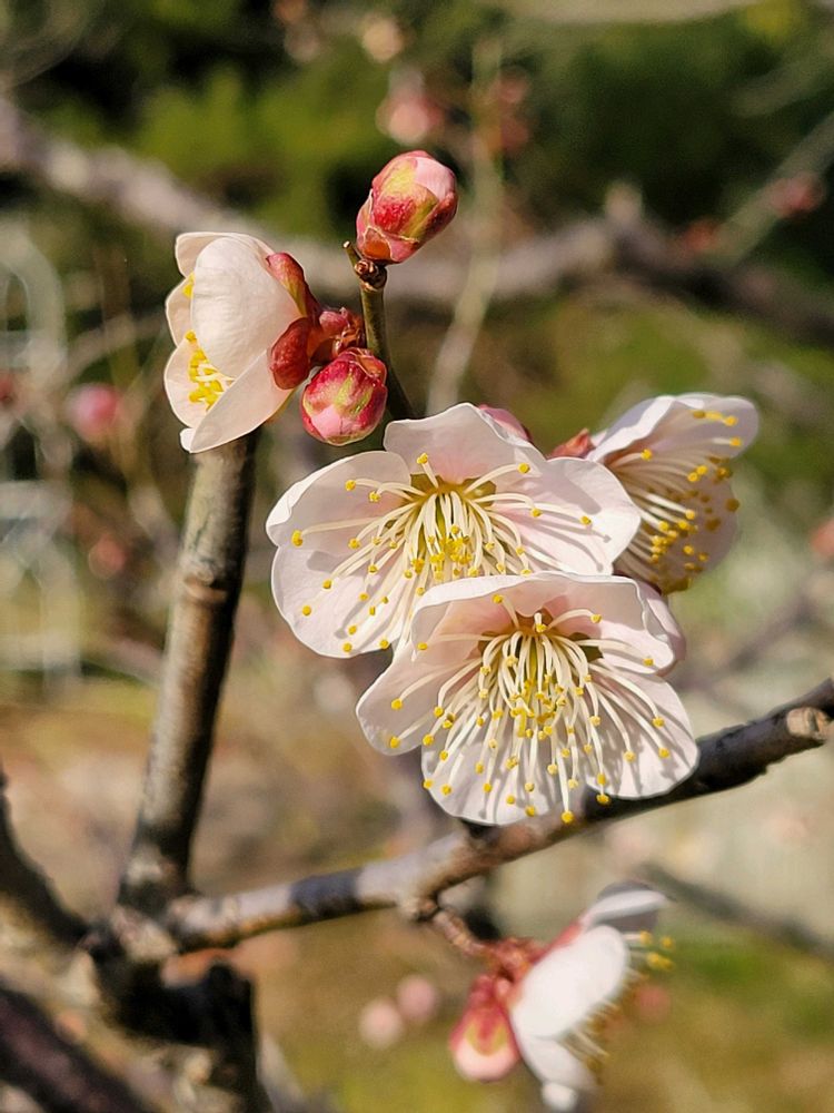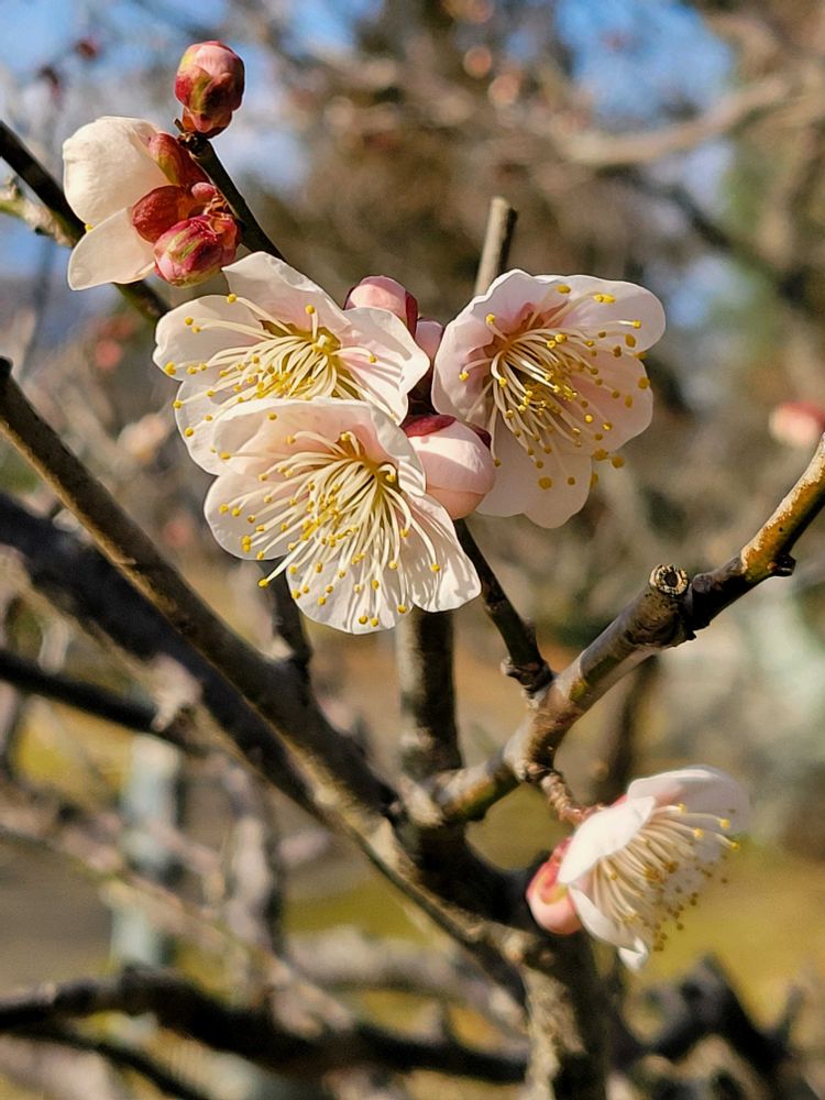 遅れていた白梅がようやく咲き始め、爽やかな芳香を漂わせていました(①② ③)。