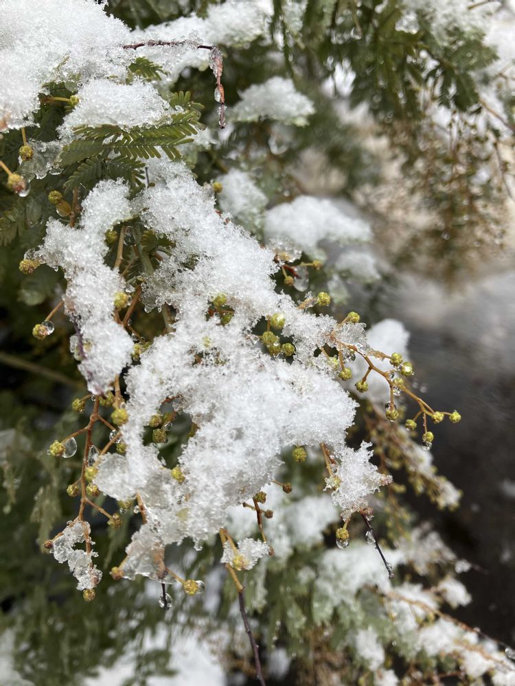 庭のミモザの蕾にも雪が❄️