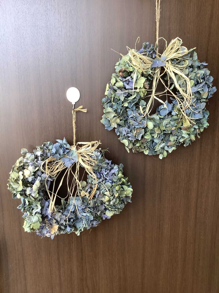 庭のアジサイを秋にドライフラワーにした物を使ったけど、今回は保管方法に失敗。たくさんできたから紙袋に詰め込んで放置していたら花の形ぐしゃぐしゃ。
