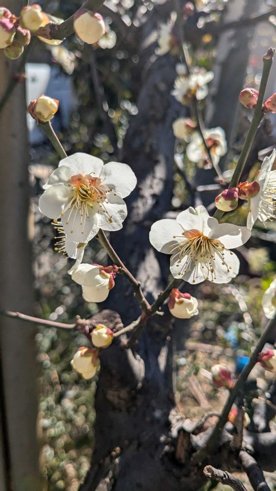 寂しかった庭に白梅が朝日を浴びて眩しい
